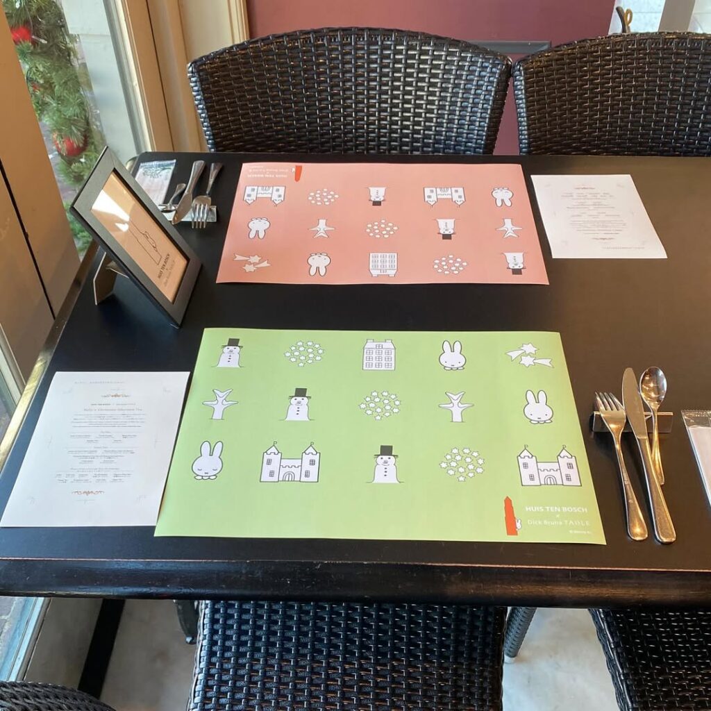 ハウステンボスで開催中の「HUIS TEN BOSCH×Dick Bruna TABLE」ホテルアムステルダム内の『アクールベールカフェ』内で使用されているランチョンマット(赤、緑)を神戸店でも期間中提供しています。なんと神戸店のみ黄色、赤、緑の3色です。